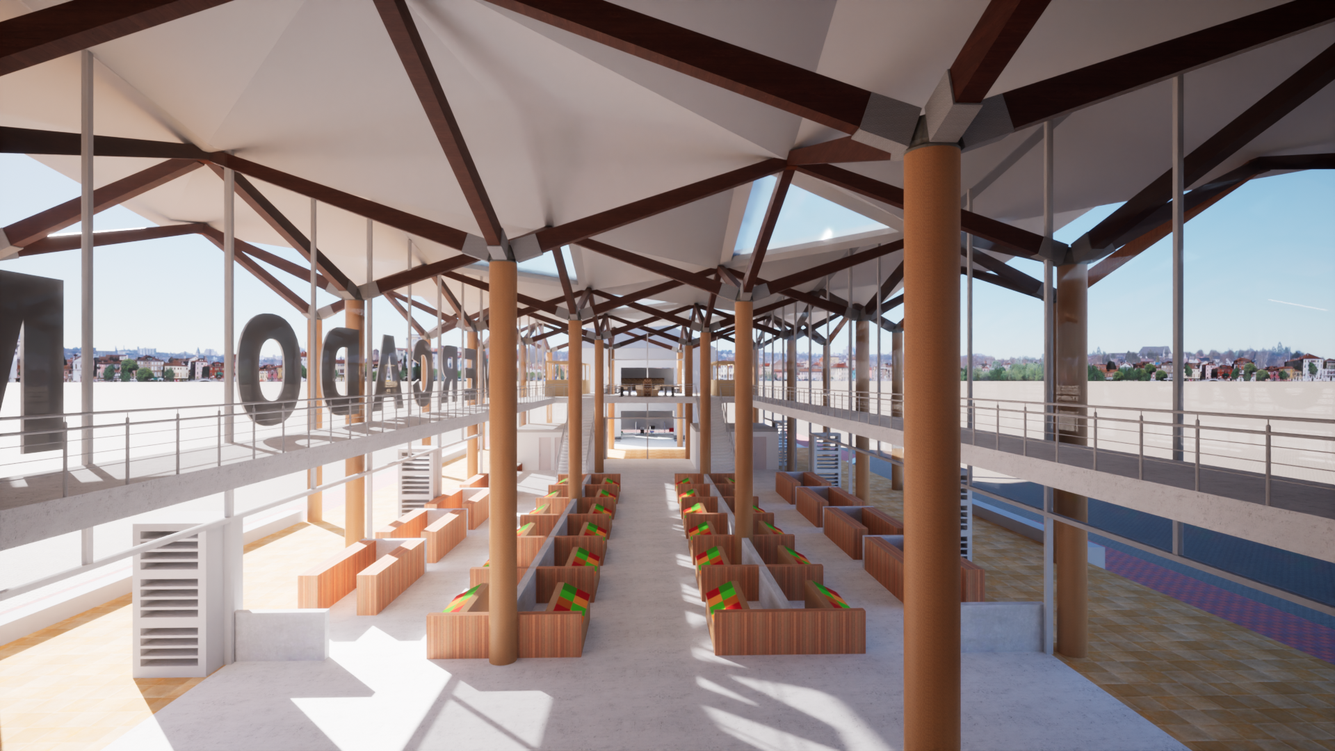 Uno de los elementos más destacados del diseño es su sistema estructural, conformado por una serie de columnas en concreto dispuestas de manera intercalada, lo que genera un ritmo visual interesante y permite una distribución eficiente de cargas. La parte más importante del proyecto es la gran cubierta, compuesta por plegaduras que no solo aportan una identidad arquitectónica única, sino que también cumplen una función ambiental: canalizan las aguas lluvias hacia columnas especiales que actúan como recolectores. Esta agua es posteriormente reutilizada dentro de la plaza, promoviendo así una solución sostenible y consciente con el entorno urbano.
